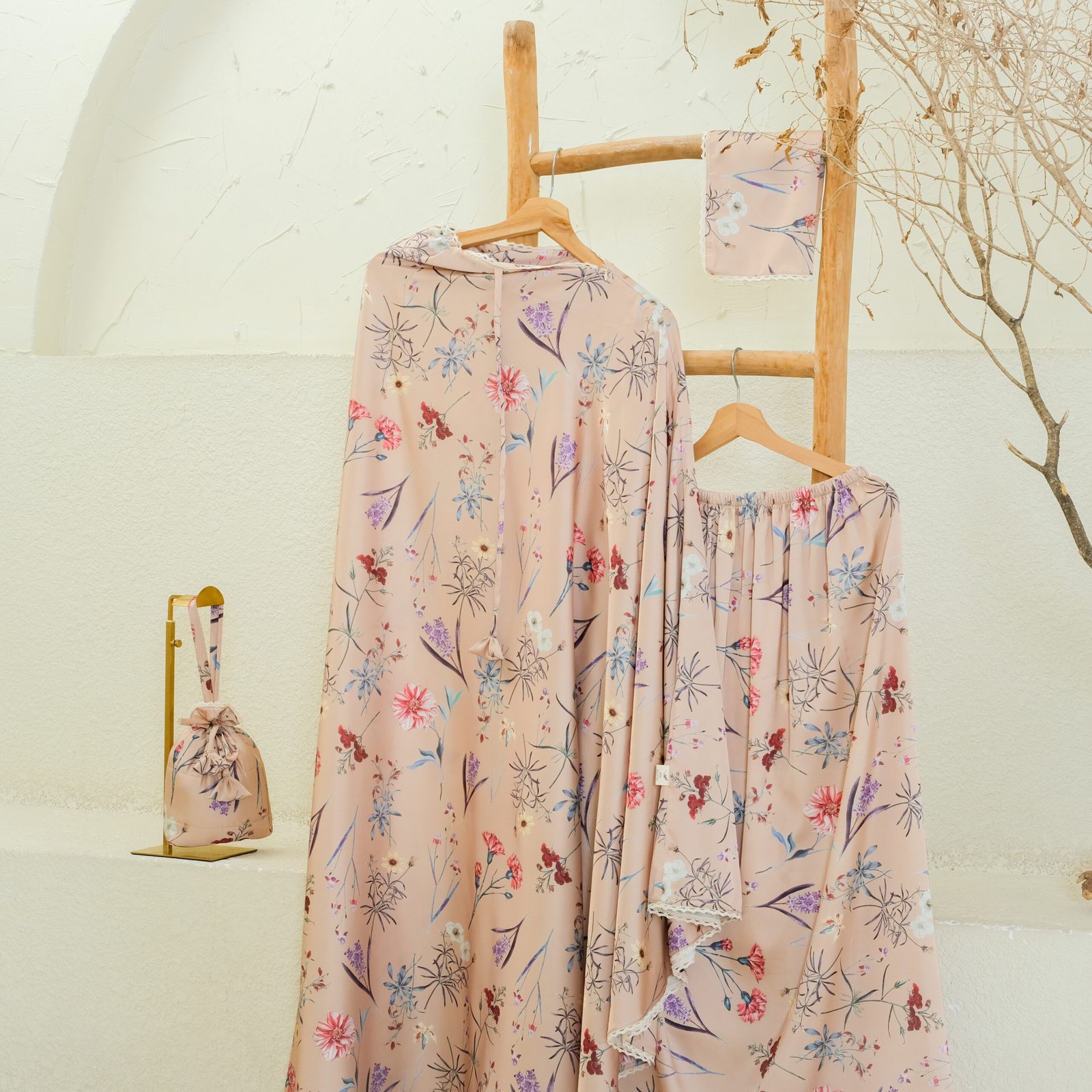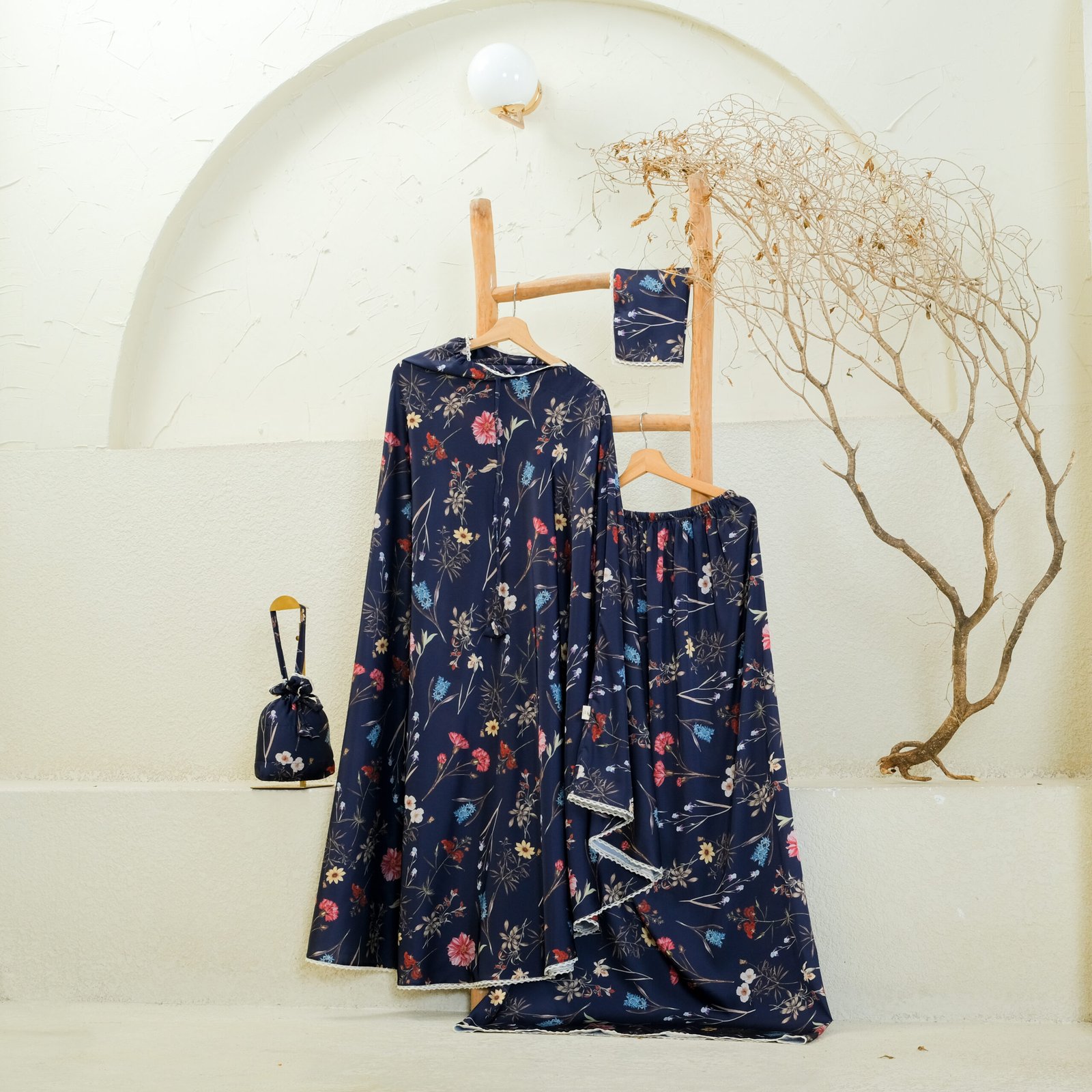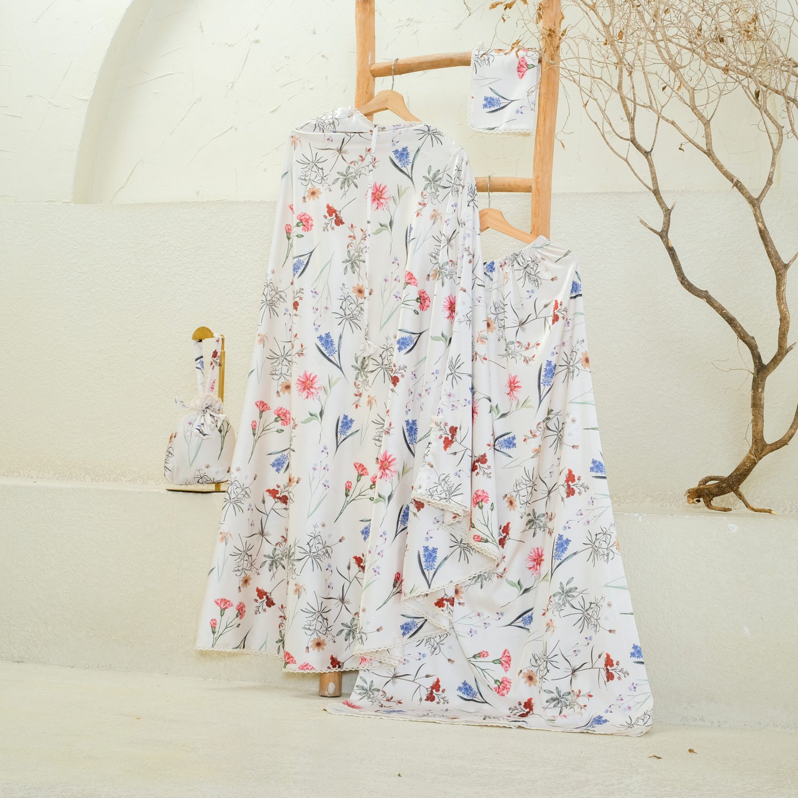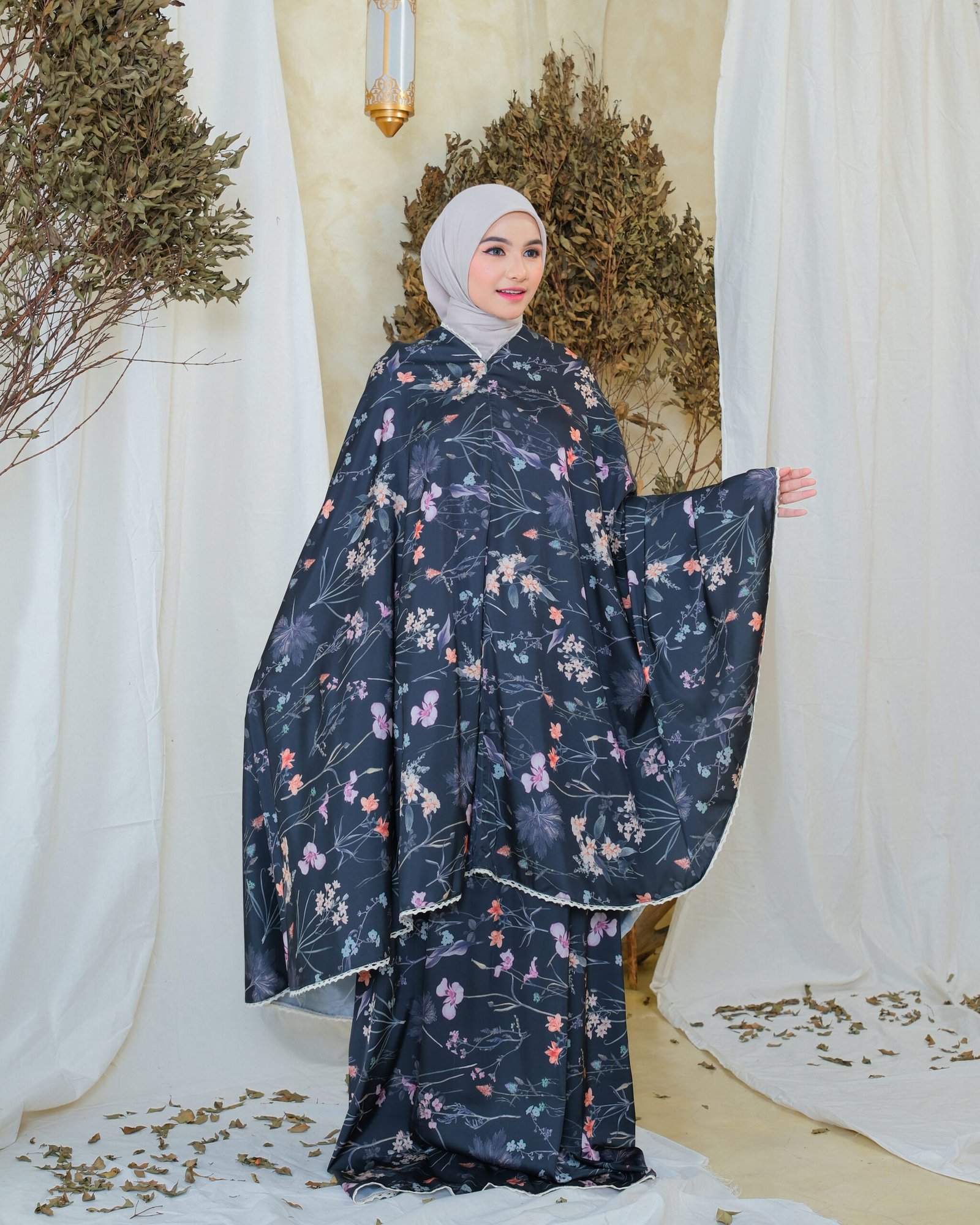 Athirah Mukena stands out in Miss Allyna’s signature collection with its bold floral motifs and refined elegance, thoughtfully designed to accompany you in every prayer. Made from premium silk that flows beautifully, Athirah combines vibrant patterns with delicate lace accents, creating a look that feels both graceful and distinctive.