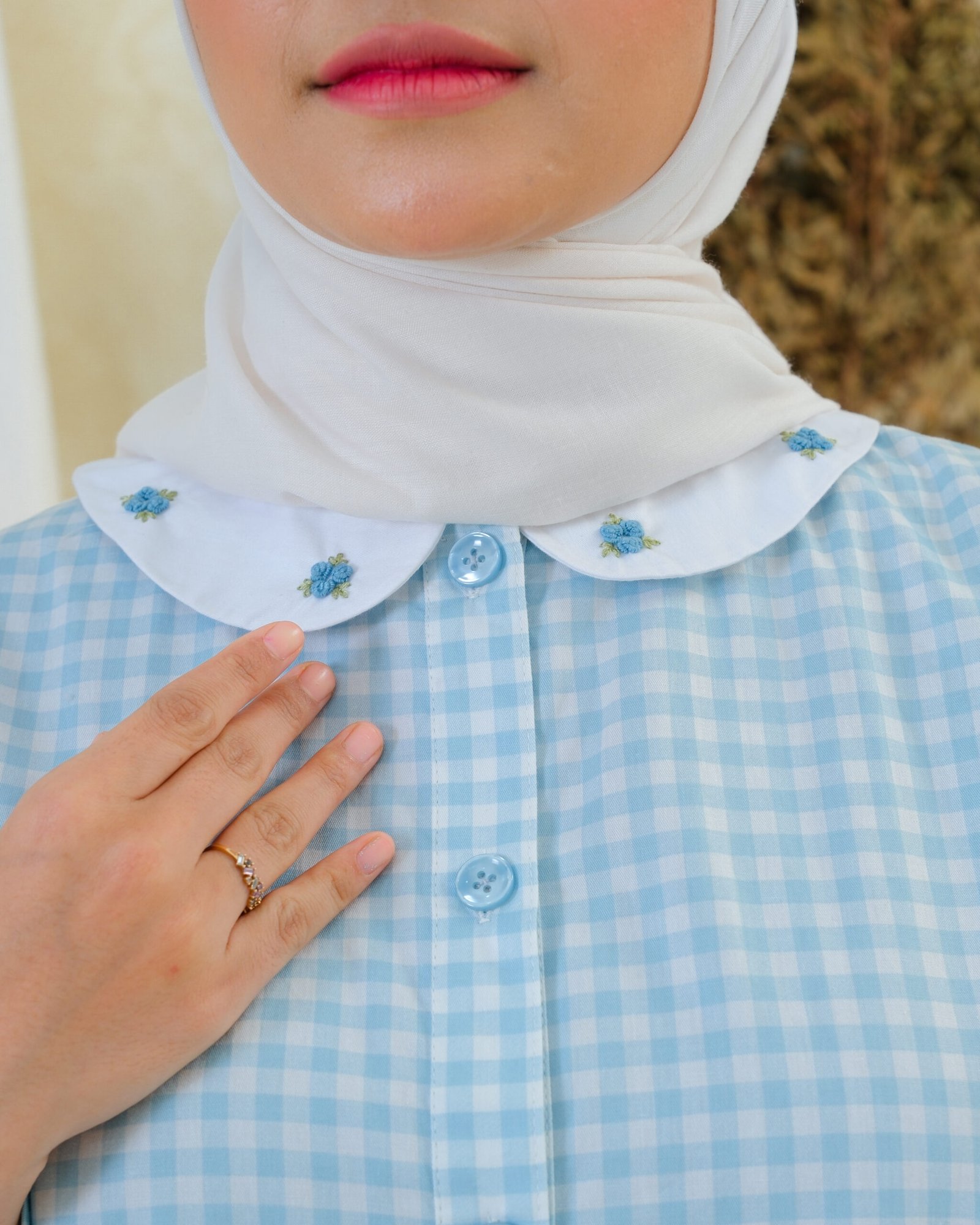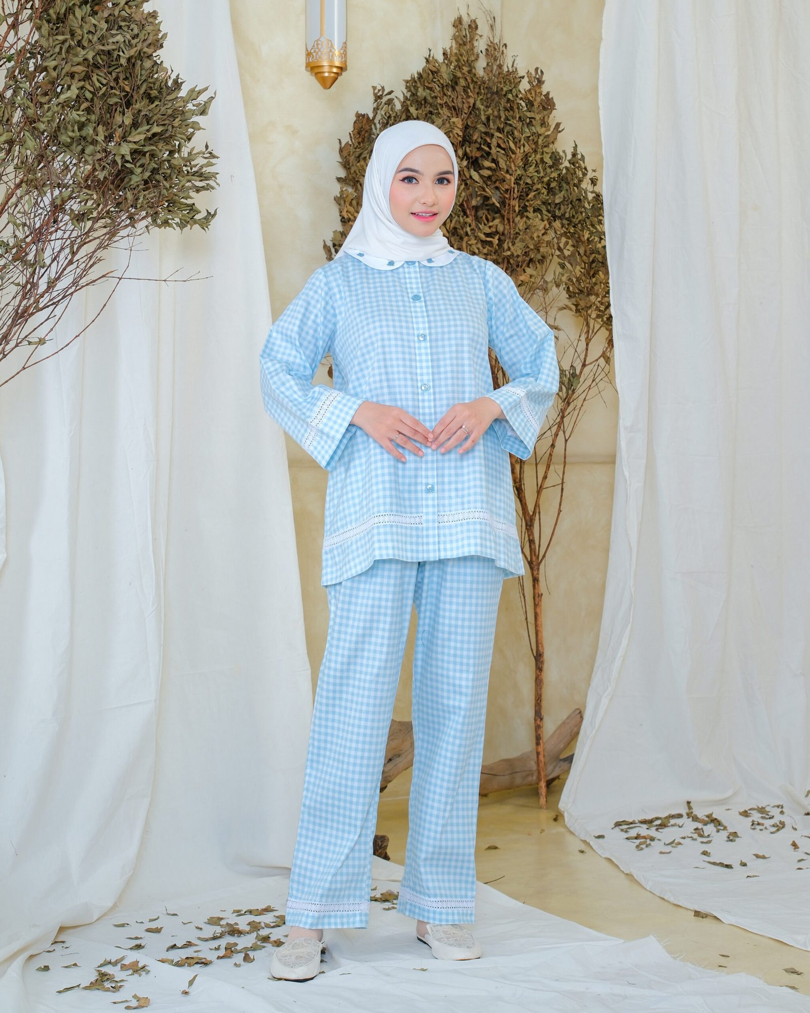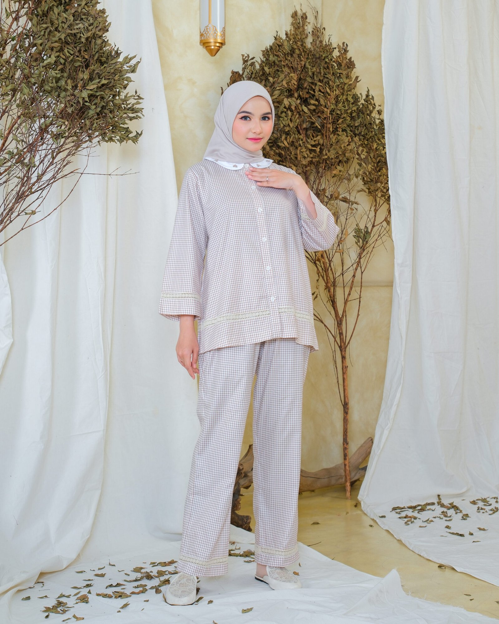 Keistimewaan Tsuma terletak pada kerahnya yang dihiasi bordir bunga yang anggun, dipadukan dengan detail renda halus yang menambah pesona feminin. Atasan dilengkapi bukaan kancing depan yang praktis, ramah untuk menyusui, sekaligus tetap stylish. Dipadukan dengan celana panjang berpinggang karet, memberikan kenyamanan tanpa rasa menekan.