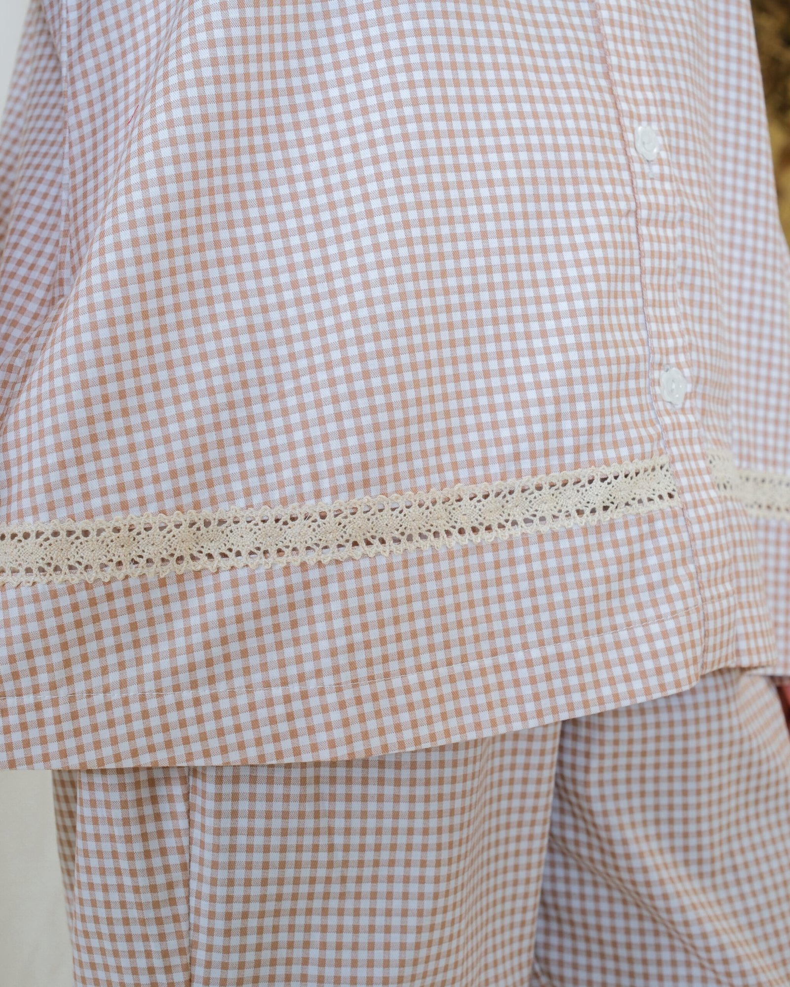 With neat tailoring and refined handmade details, this pajama set blends comfort and sophistication—keeping you cozy, fresh, and beautifully composed from night to day.
